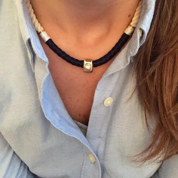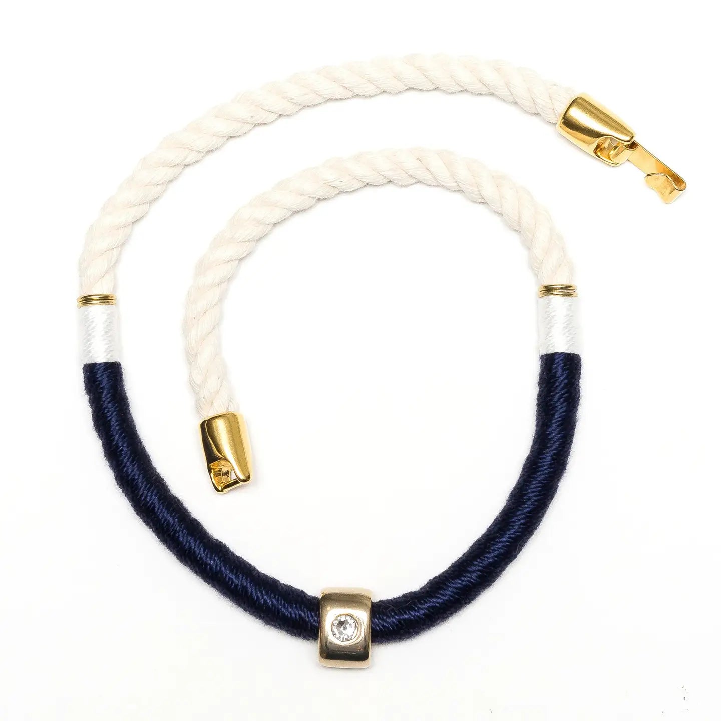 Show off your nautical style with our rhinestone wrap necklace! Natural ivory cotton rope. Gold plated rhinestone bead. Hand wrapped navy blue and white thread detail.