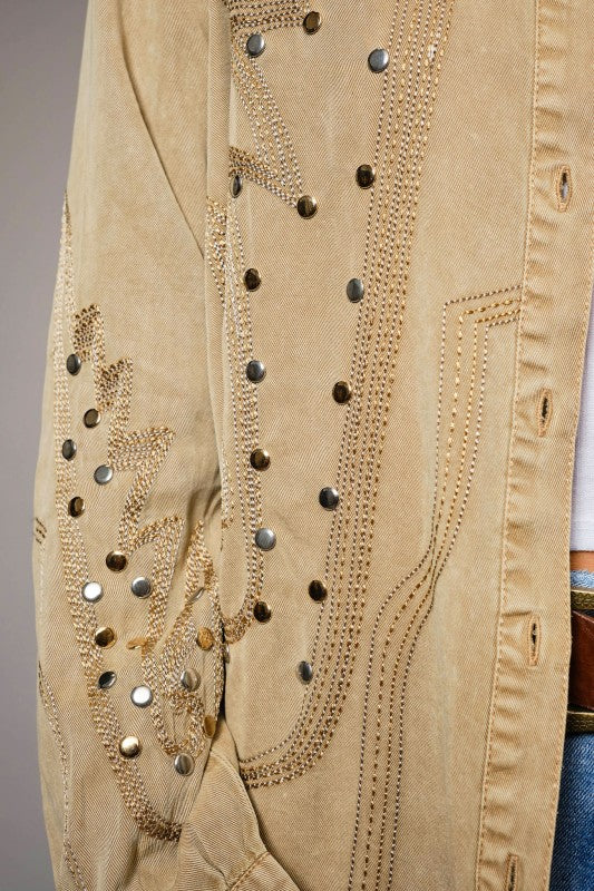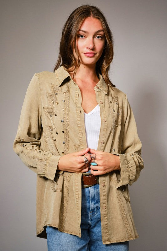 Chambray button-up shirt featuring zigzag embroidery, gold and silver studs, and a relaxed fit. Crafted from soft Tencel with a garment-washed finish.