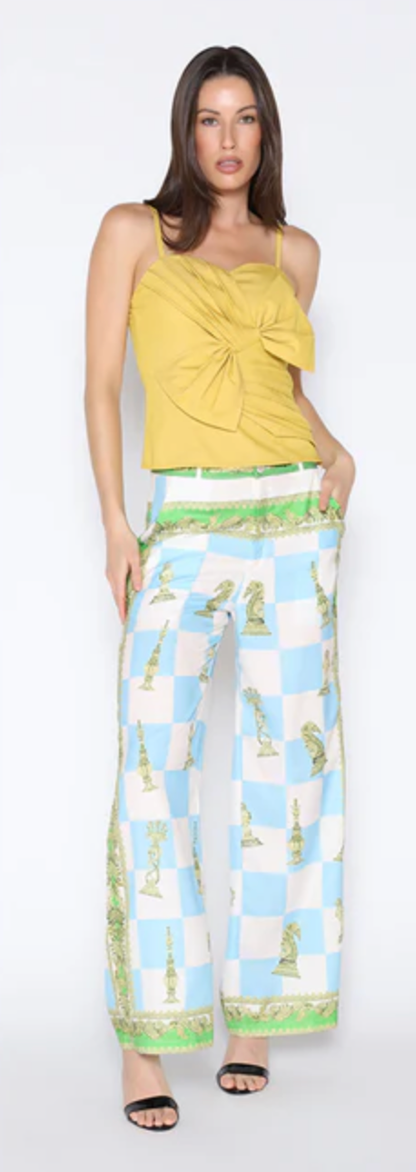 Checkmate print pant. Side pockets and zipper/ button closure.