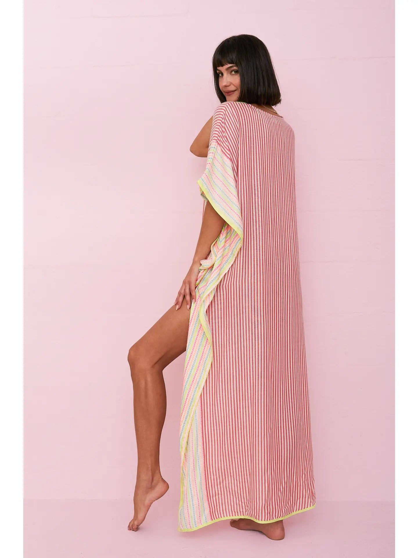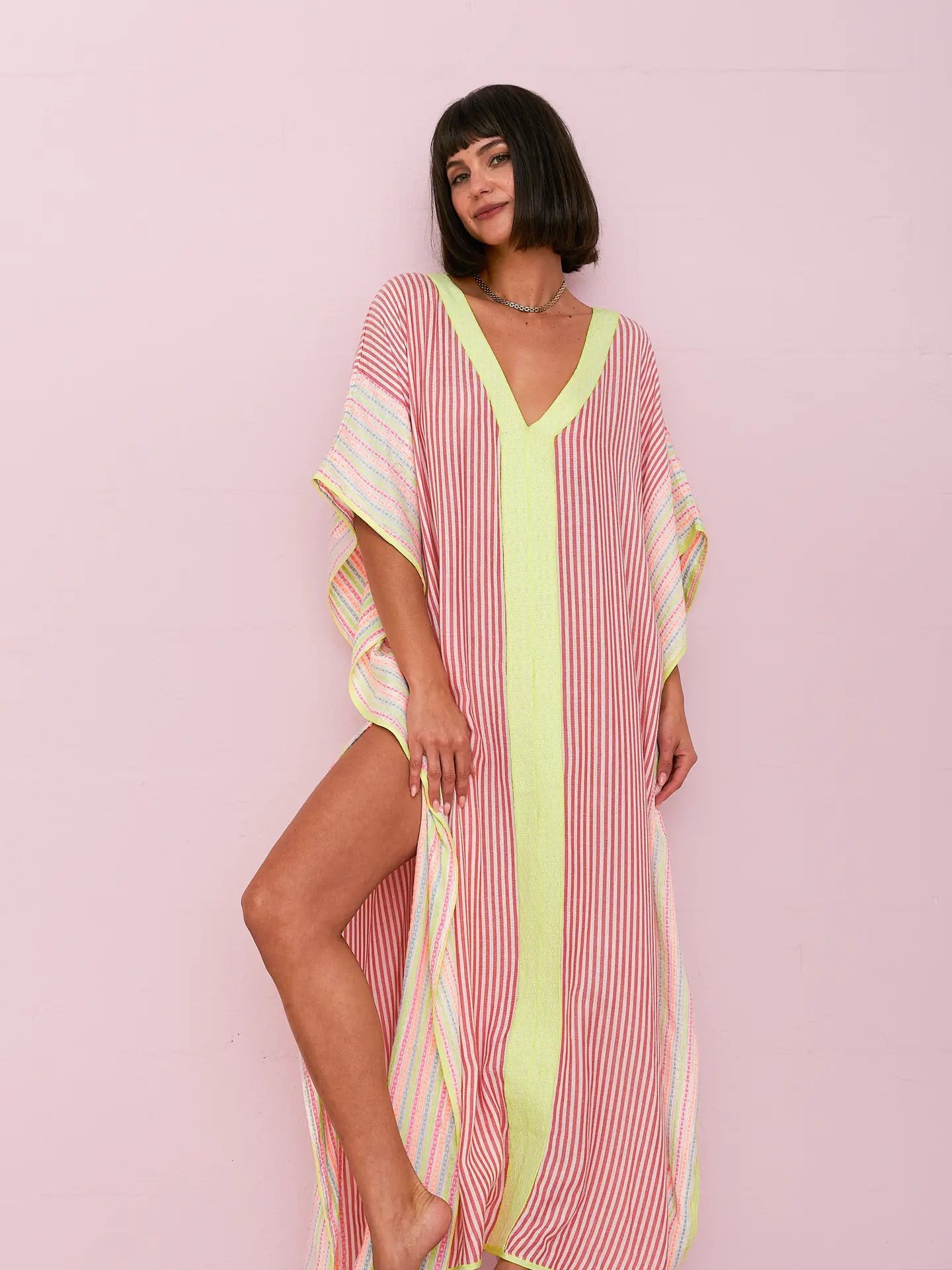 A spinoff on one of our fan favorites, the Thobe, this Contrast Striped Thobe features a delicate hand-loomed fabric in a light and breezy silhouette, with a V-neckline and an elegant contrasting striped pattern throughout the bodice. Model is 5'9" and she is wearing size Standard Fabric: 85% Viscose, 14% Spun, 1% Lurex Hand wash cold, hang dry, low heat steam if necessary Made in India Delicate fabric needs a soft touch 😉 Due to the hand-loomed weave, the fabric can catch on jewelry and bags which can pull the threads of the garment