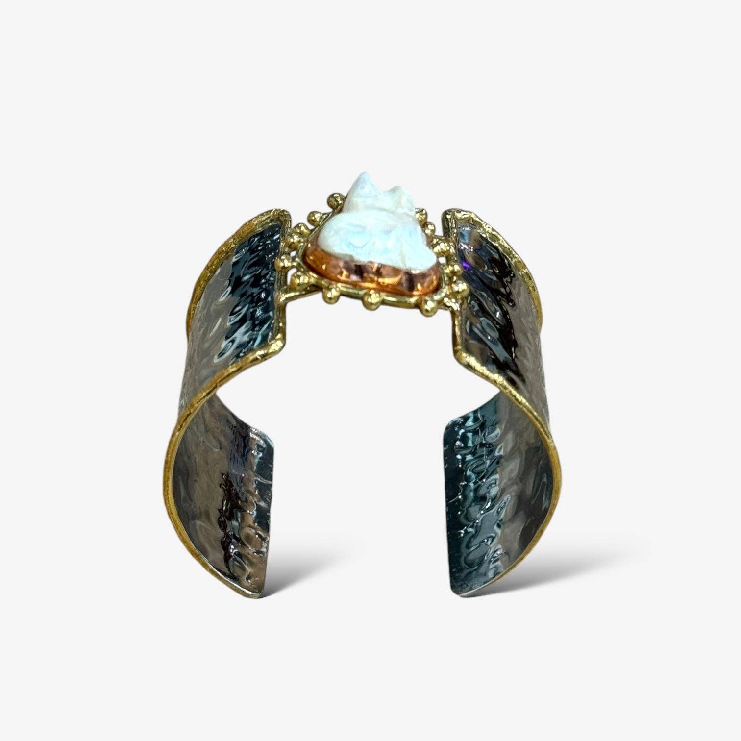 This elegant Dana Cuff features a broad hammered design with a stunning, round natural stone centerpiece.