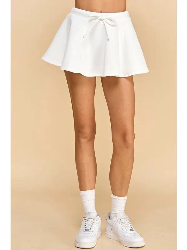 Knit flared skirt with a drawstring waistband and built-in shorts. Model Sze + Fit: Model height: 5'9" Dress size: Small Bust: 3 Waist: 25 Hips: 34