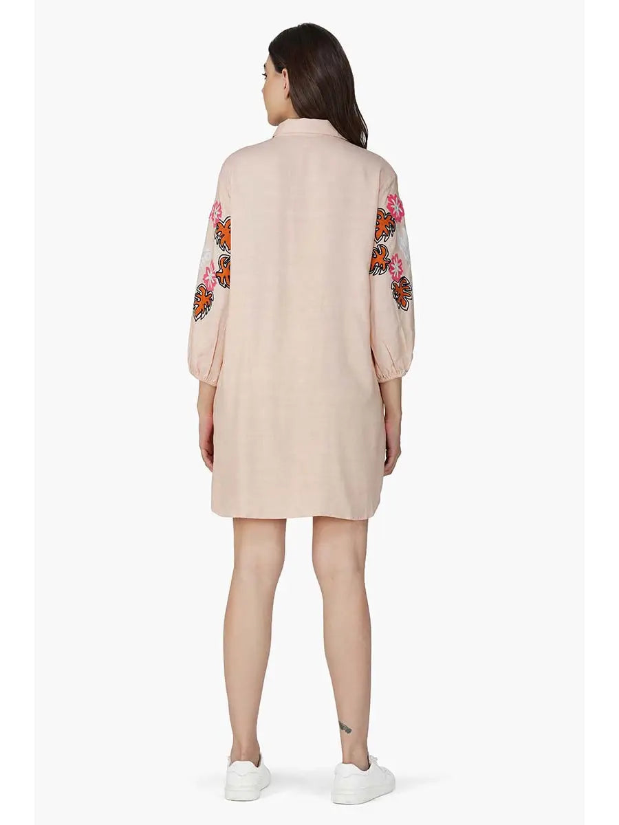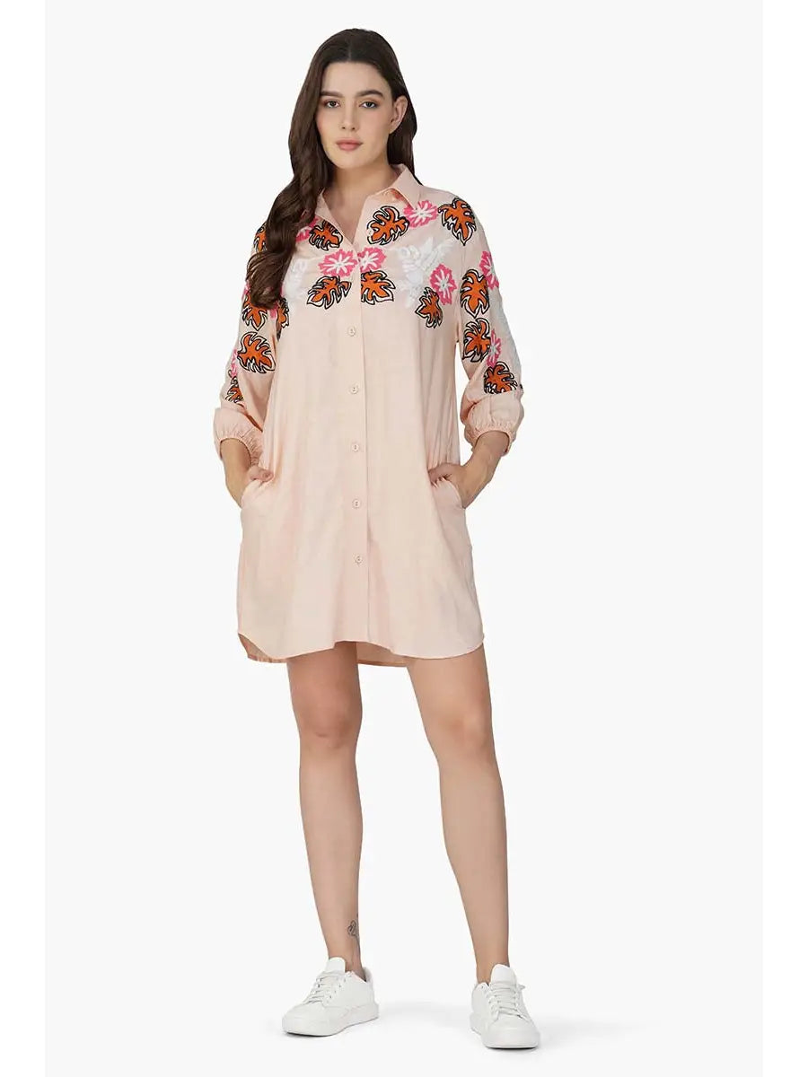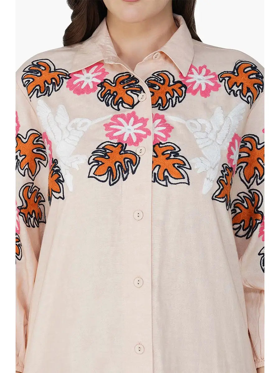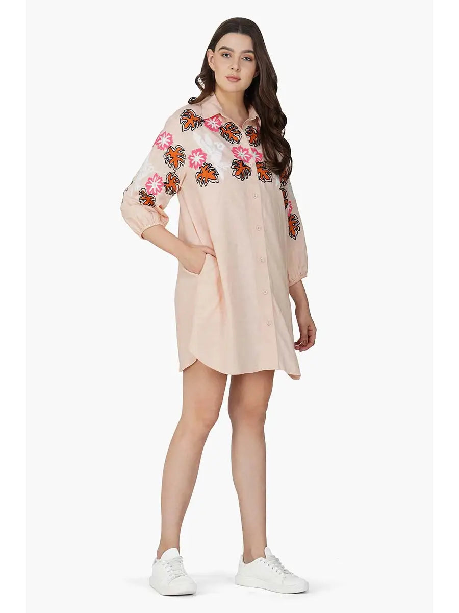 Looking for a ‘wow’ shirt dress? This one’s got all the moves: relaxed, cute, and just a hint of wildflower magic! With its relaxed, baggy fit and gorgeous floral leaf embroidery, this dress does easy, breezy, and beautiful in one. Button it up, add some sneakers or ankle boots, and let those puffed sleeves and floral details do all the talking