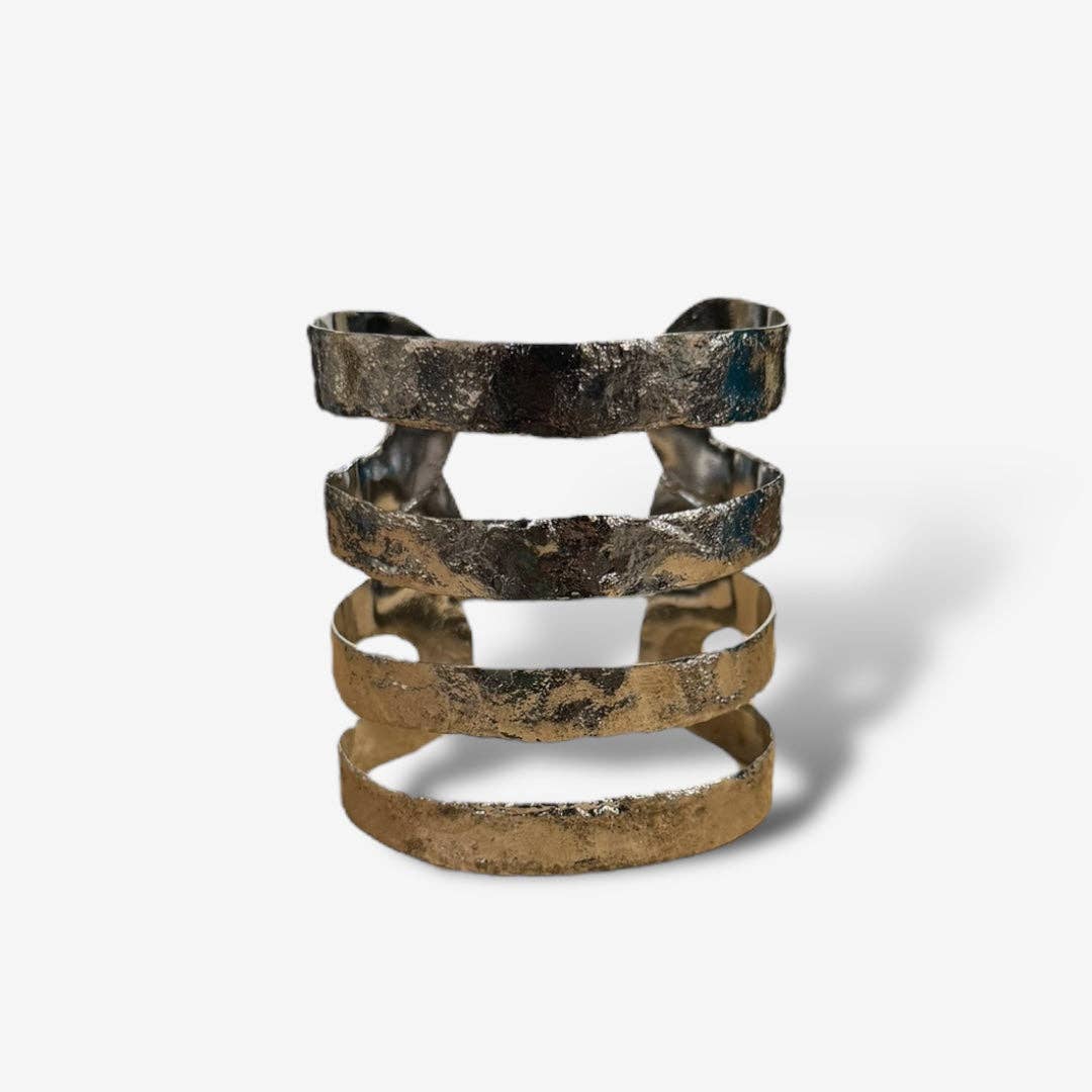 Wide Gold tone cuff bracelet featuring multiple horizontal bands with a textured hammered finish