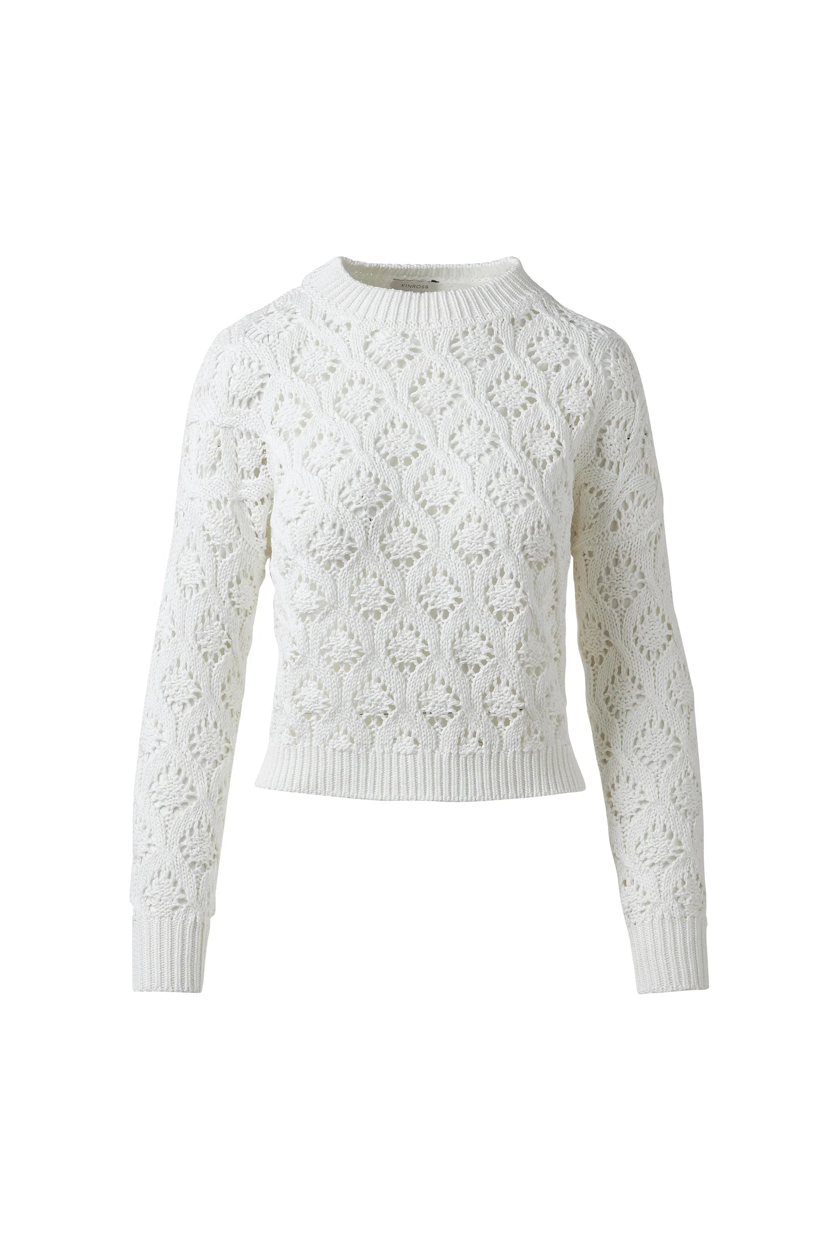 Delicate openwork detailing and a cotton-polyester blend define this lightweight crew sweater. Perfectly breathable, it offers chic layering options for a breezy spring wardrobe.