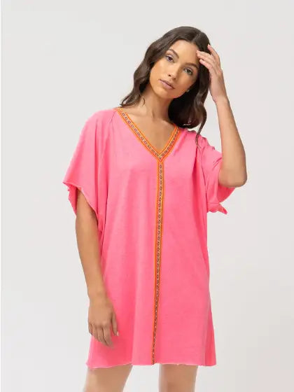 A spin-off of our Inca Abaya maxi dress, our mini's give you that same comfort and style in a shorter version. An amazingly light and colorful adaptation of the Middle Eastern Abaya, edged in our signature Inca trim.