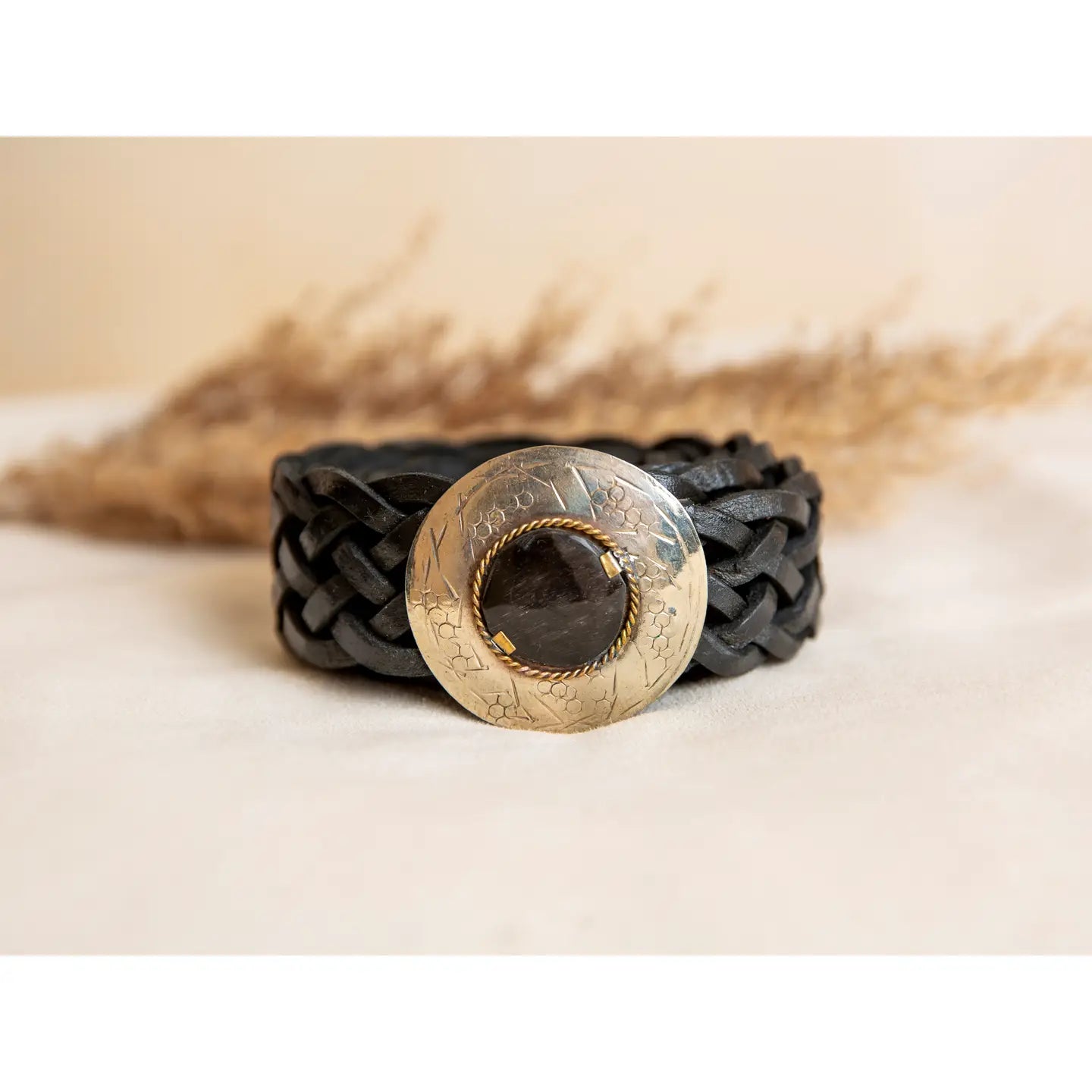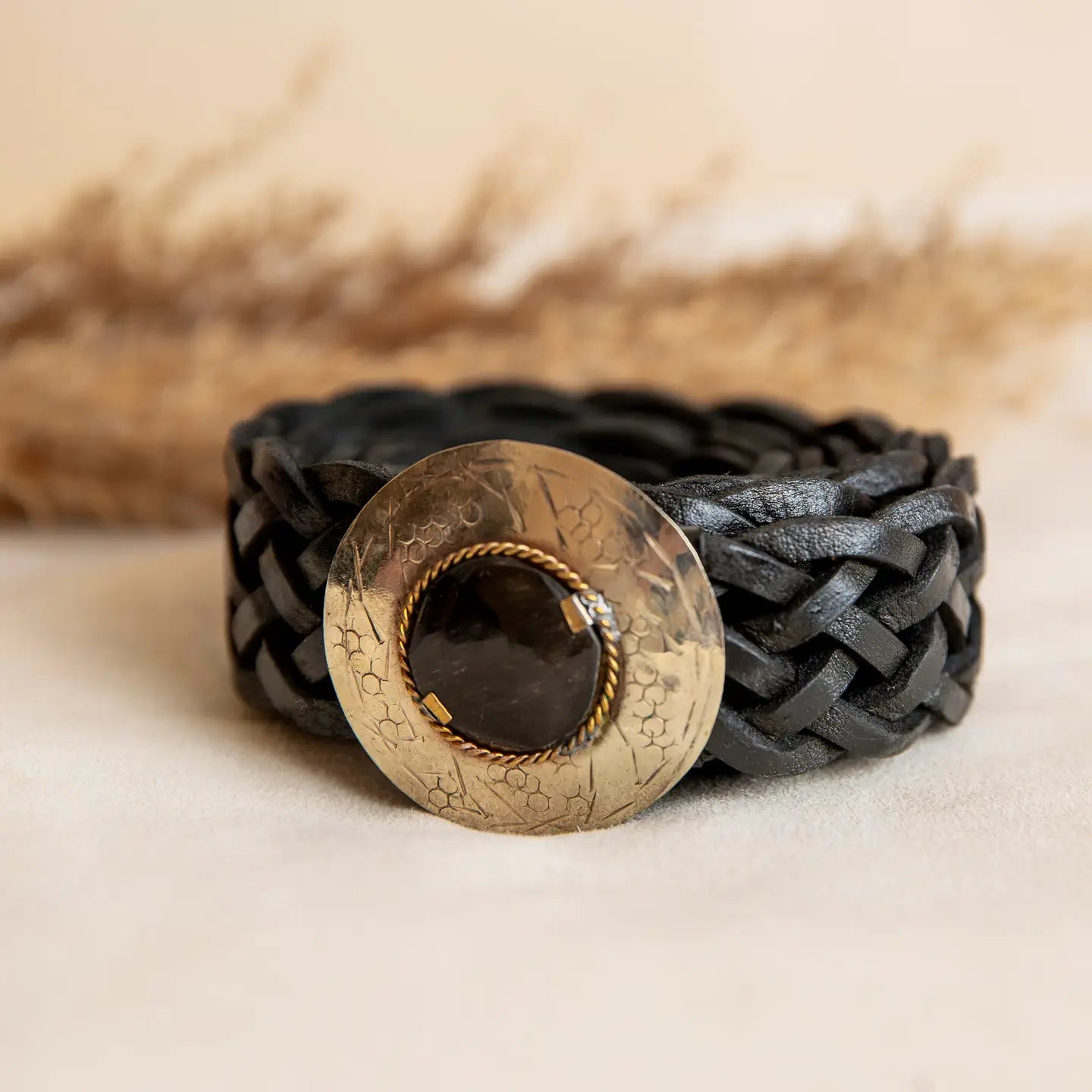 Braided belt made of genuine leather in black. Its round brass buckle with a mother-of-pearl stone in two shades is the ideal detail to pair with any of your more summery and boho-style looks. Hook closure to adapt to any size. With a current and modern design, they are handcrafted, so the stones may acquire different shades. Measurements: strap length 105 cm, width 3 cm. Buckle: diameter 5 cm.