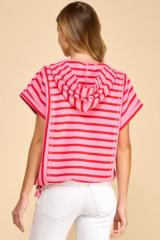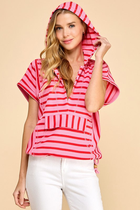 Striped split neckline hoodie with a front pocket ad drawstring hem. Model Size + Fit: Model height: 5'9"Dress size: Small Bust: 33 Waist: 25 Hips: 34