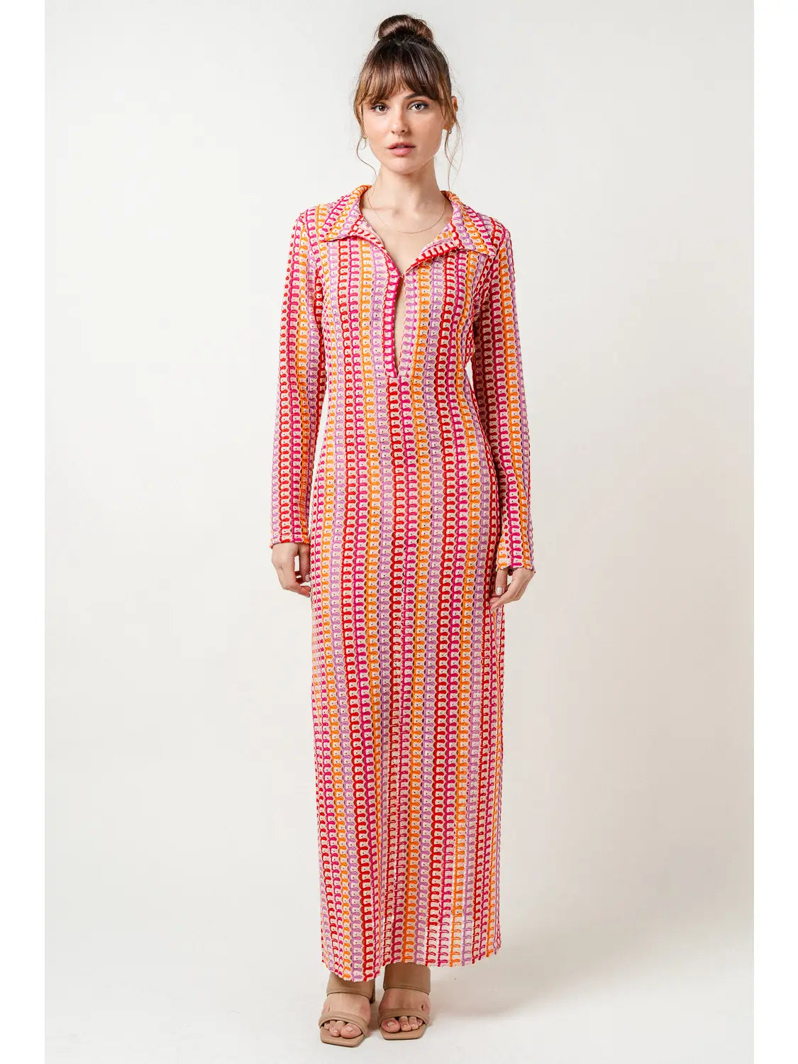 Elevate your resort style with our Retro Colorblock Maxi Dress, featuring a chic collar V-neckline and a daring center chest cutout. The form-fitting bodice and long sleeves offer a sophisticated silhouette, while side split details add a playful touch. Perfect as a bikini cover-up or for evening outings, this dress combines vintage charm with modern elegance. -COLLAR V NECKLINE -CENTER CHEST CUTOUT -LONG SLEEVES -FORM FITTING -SIDE SPLIT DETAILS -RETRO VINTAGE COLORBLOCK PATTERN -RESORT VACATION BIKINI COVER UP -MAXI DRESS LENGTH