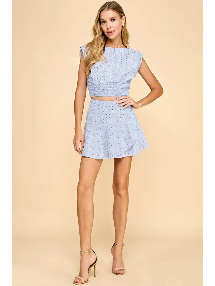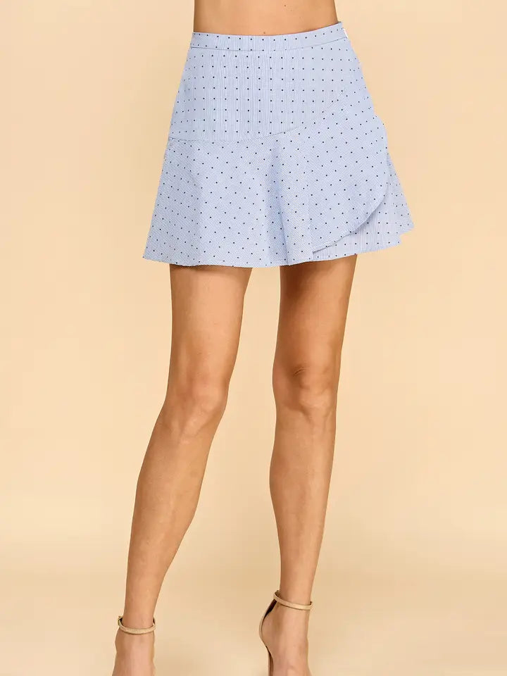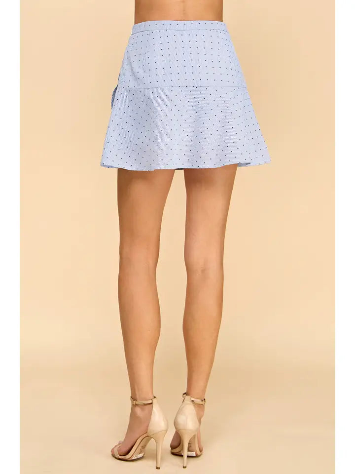 Micro polka dot print skirt featuring a front wrap design and side hidden zipper closure. Model Size + Fit: Model height: 5'9" Dress size: Small Bust: 33 Waist: 25 Hips: 34