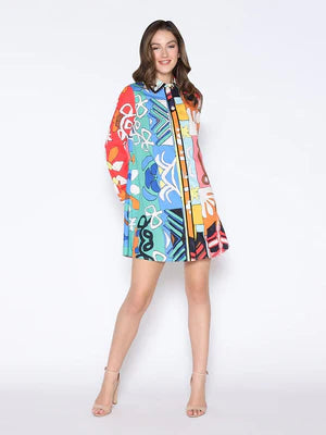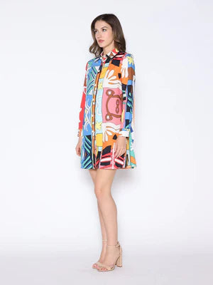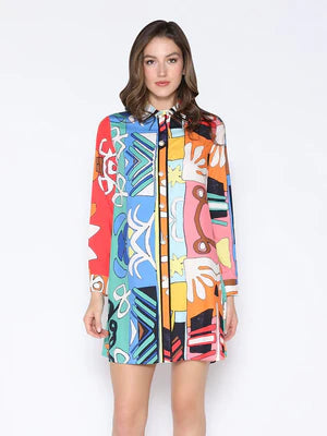 Turn heads in this statement dress! Features all over print and faux pearl buttons.