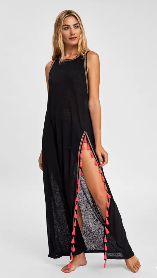 A U-shaped neckline and tassel detailed side slit spice up the classic look of a traditional maxi cover-up that's perfect for beach vacations.