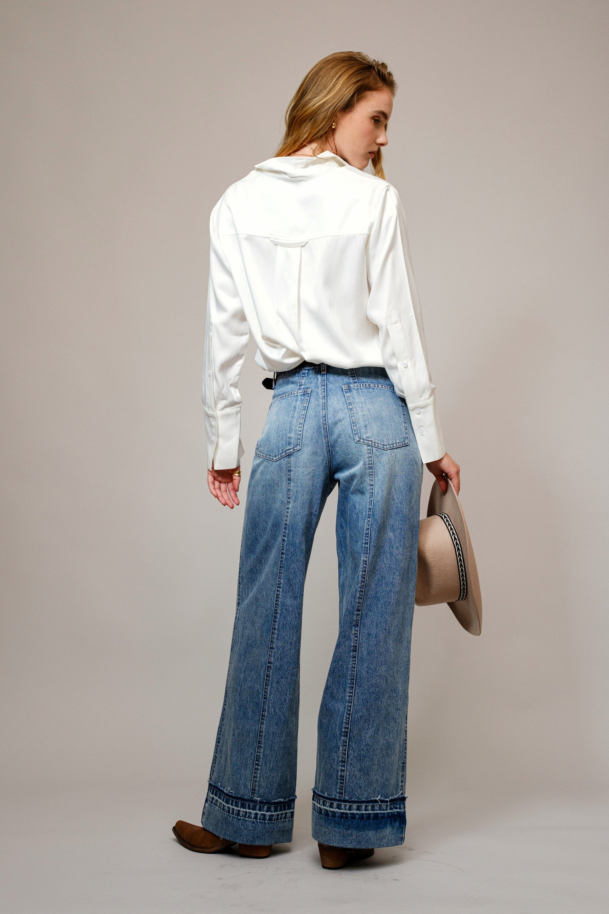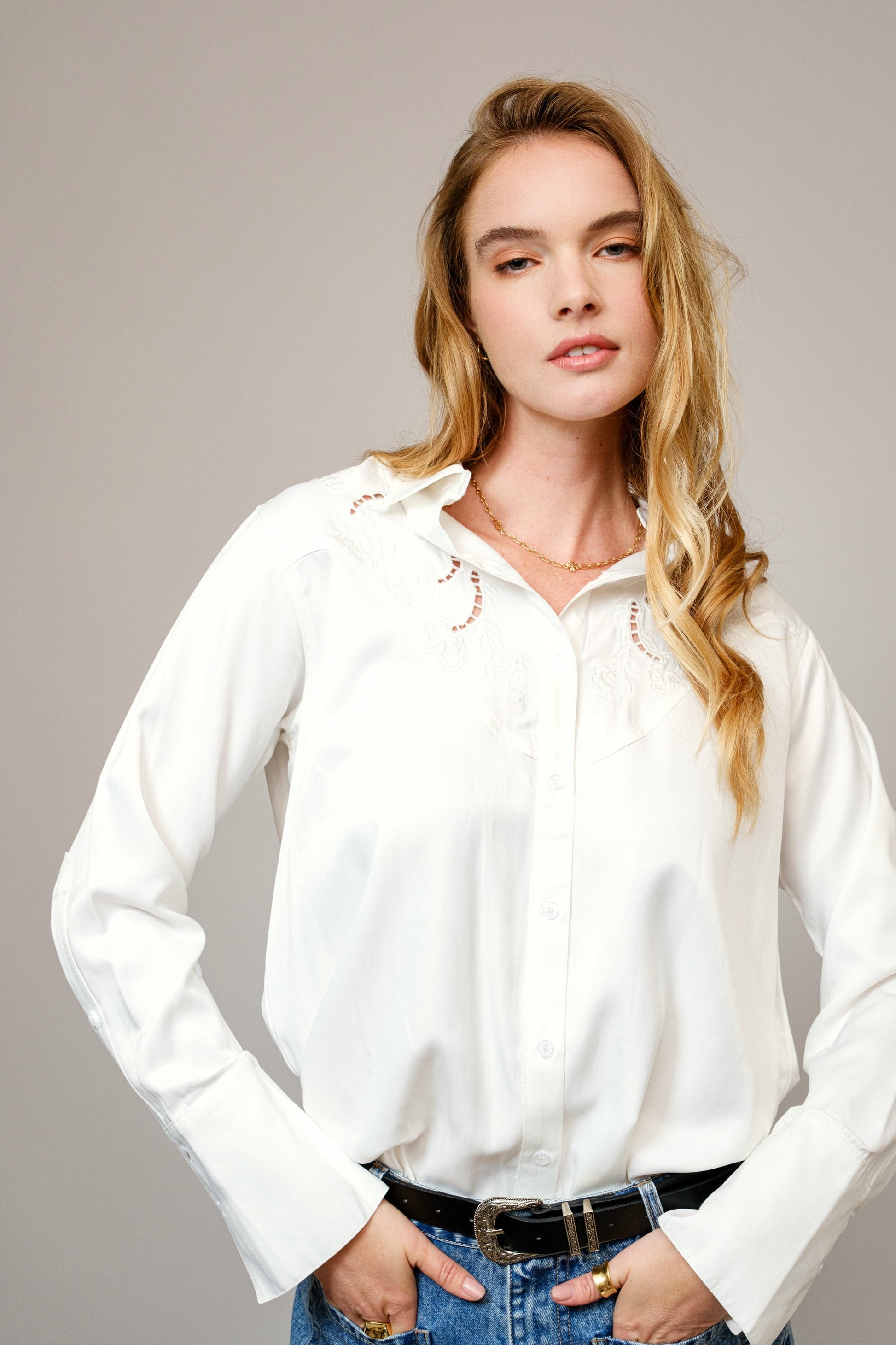 Western-inspired button-up blouse with embroidered yoke and cutout details. Made from lightweight matte satin for a smooth, flowy fit. Features a classic collar, long sleeves, and buttoned cuffs for a polished look.